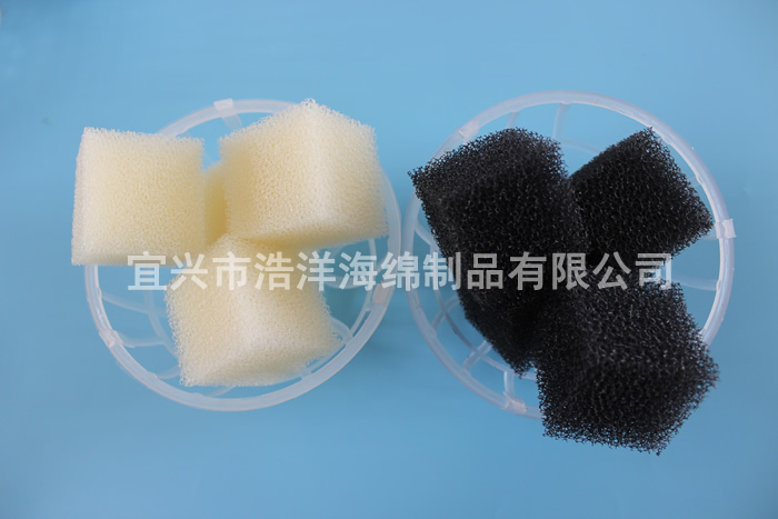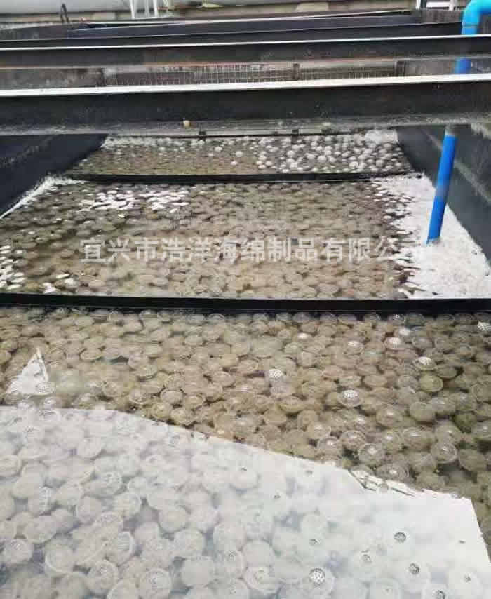 將我公司特殊工藝生產(chǎn)的聚氨酯海綿作為培菌載體。填充在 PP / PE 材質(zhì)制作的懸浮球中,由于該生物載體的多孔網(wǎng)狀特殊結構,提高了生物培養載體的比表面積。突破點(diǎn)是在曝氣池內單個(gè)生物載體的外表面實(shí)現亞硝化反應,在內部實(shí)現亞硝酸鹽的反硝化,其中不僅有簡(jiǎn)單的物理吸附,還有正、負電荷的引力。使載體表面帶有一定的陽(yáng)離子活性基團及經(jīng)基等親水性基團,可與污水中帶有負電荷的微生物產(chǎn)生鍵、價(jià)的固定結合,從而將微生物及生物酶牢固的固定在載體上。使成活后的微生物不容易在水、氣的剪切作用下流失。微生物的負載量大,容積負荷高,從而使污水中的氨氮、總氮達到同時(shí)下降的目的。它同時(shí)還具有切割氣泡能力強,空間體積利用率大、無(wú)死區等優(yōu)點(diǎn)。是當前生物處理技術(shù)中微生物載體理想的產(chǎn)品。